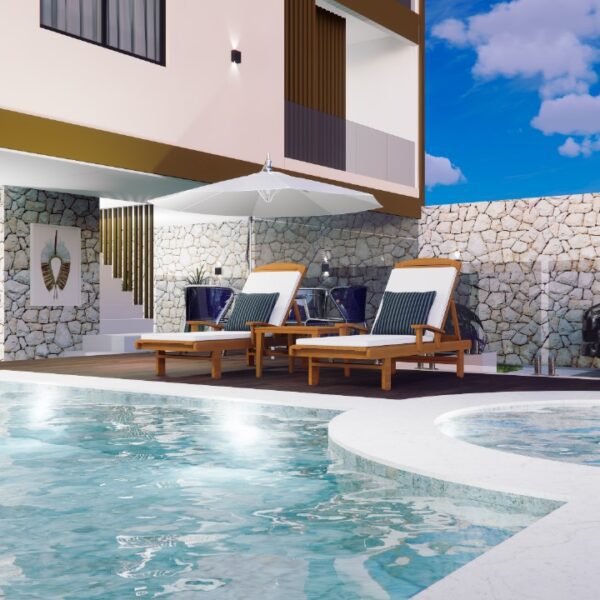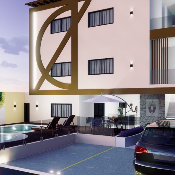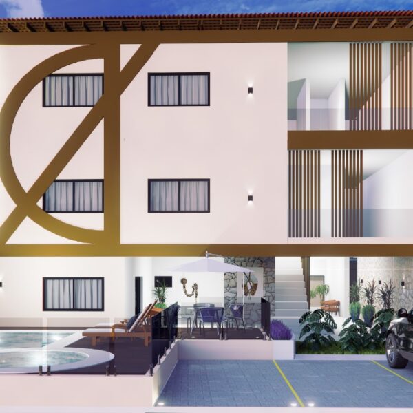 Sala integrada com a cozinha, sendo sala com pé direito duplo